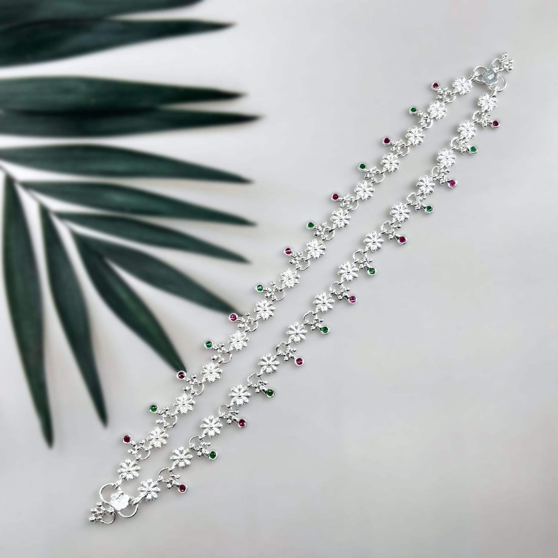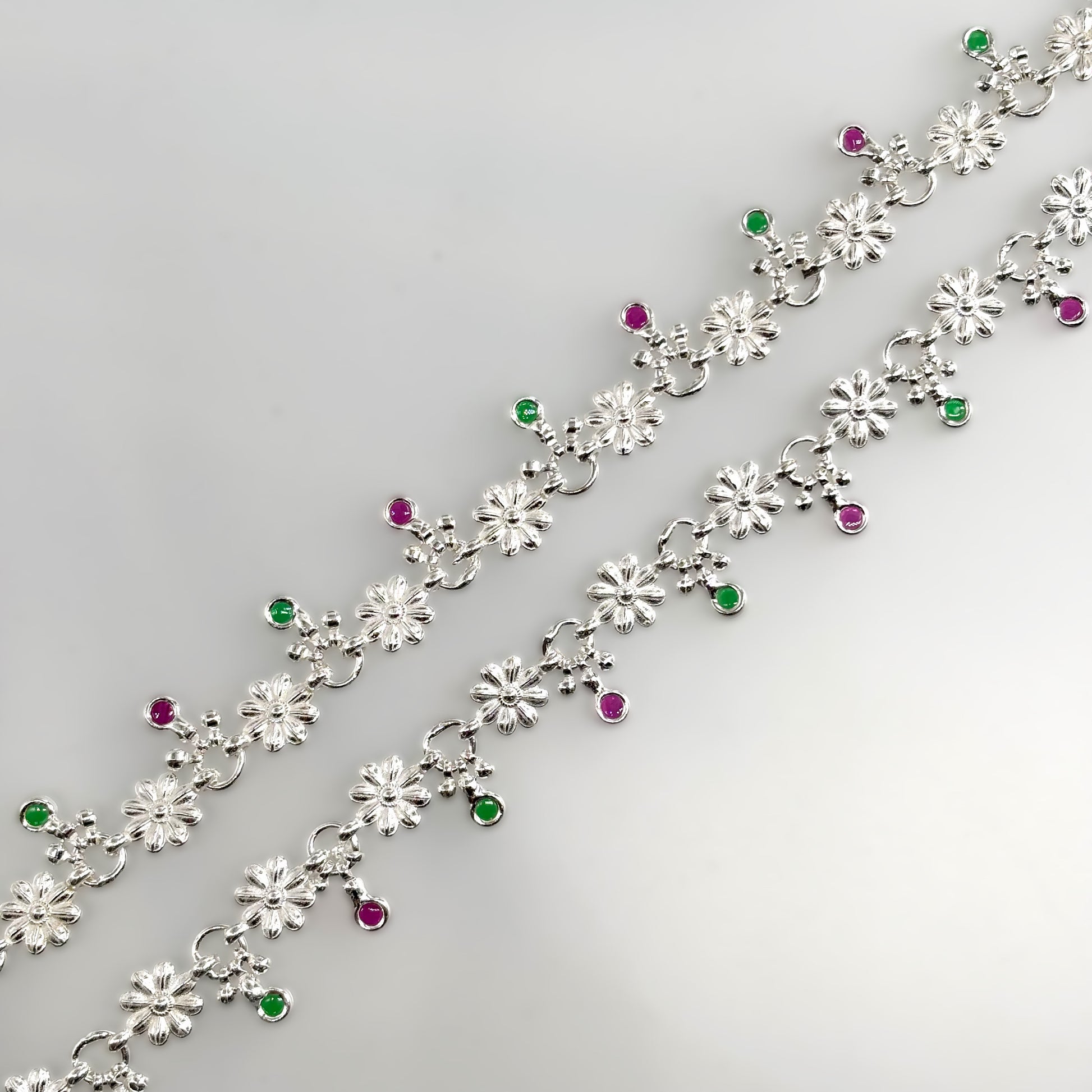 Step into elegance with this floral silver payal (anklet), beautifully handcrafted from 92.5 sterling silver. The anklet features intricate flower motifs adorned with green and pink stone embellishments, giving it a fresh and graceful charm. With a 10-inch length, it blends tradition with a modern touch, making it perfect for festive wear and everyday elegance.
