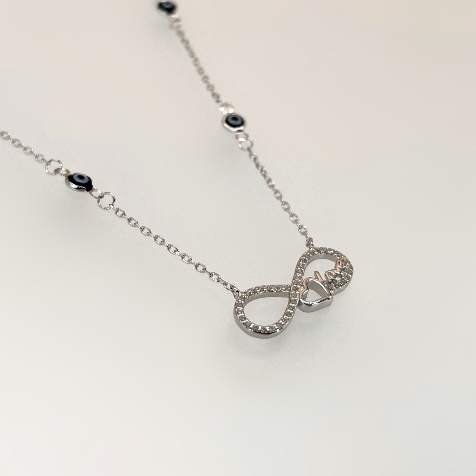 • Design: Infinity “Love” motif with heart and evil-eye detailing