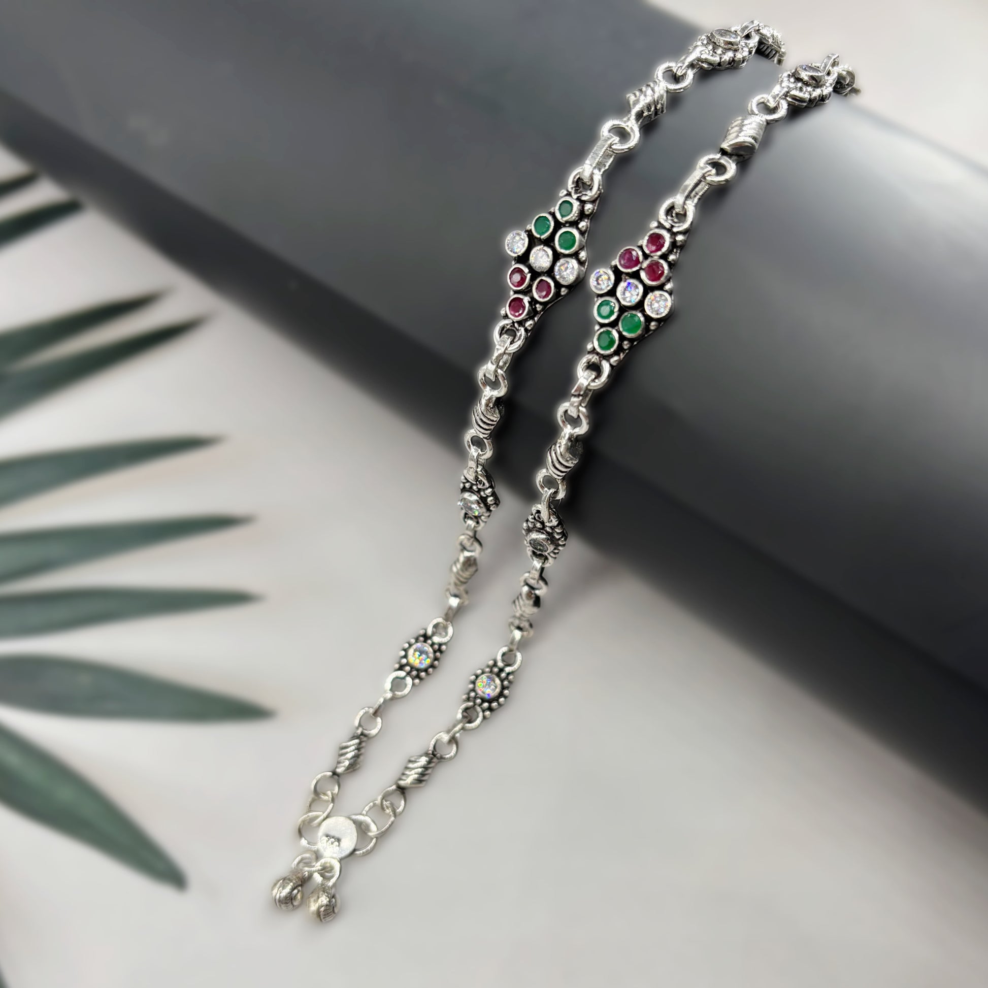 Embrace traditional elegance with this handmade oxidised silver anklet (payal), crafted from 92.5 sterling silver. Adorned with vibrant cut stones in green, red, and white, this piece carries timeless artistry and intricate craftsmanship. The oxidised finish enhances its antique charm, making it a perfect blend of tradition and modern grace.