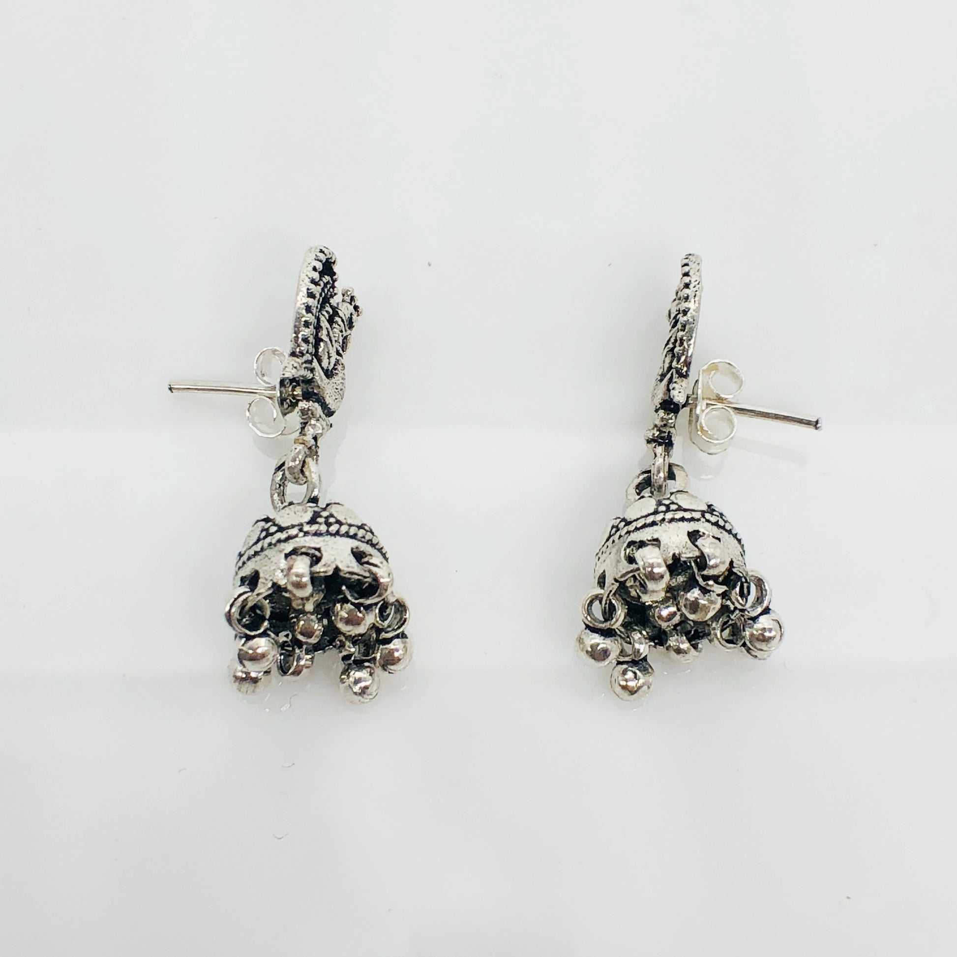 Elevate your ethnic style with these stunning peacock design oxidized jhumka earrings made from 92.5 sterling silver. The intricate peacock motif at the top adds a royal charm, while the traditional jhumka with tiny dangling beads completes the classic look. Perfect for festive occasions, weddings, or pairing with traditional outfits.