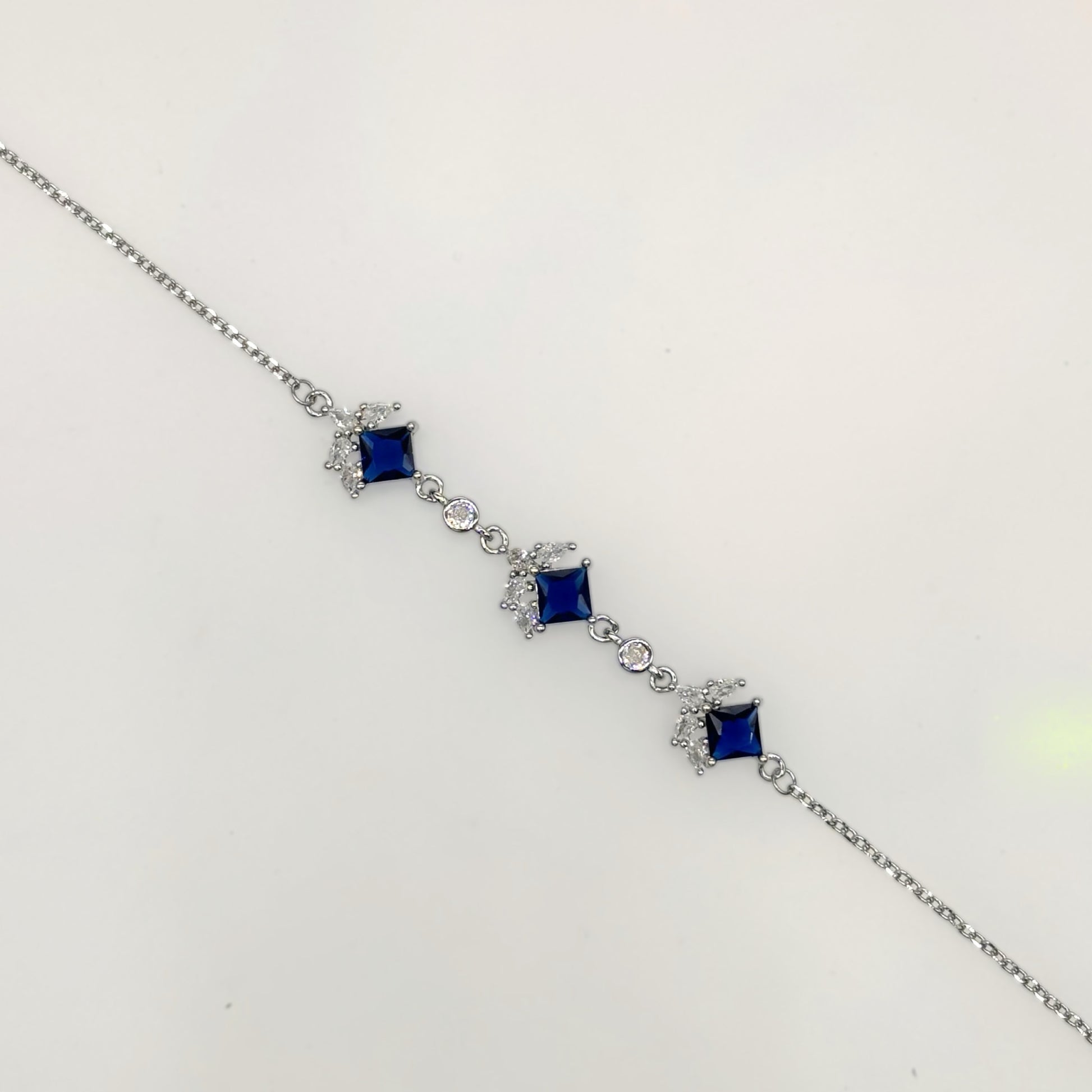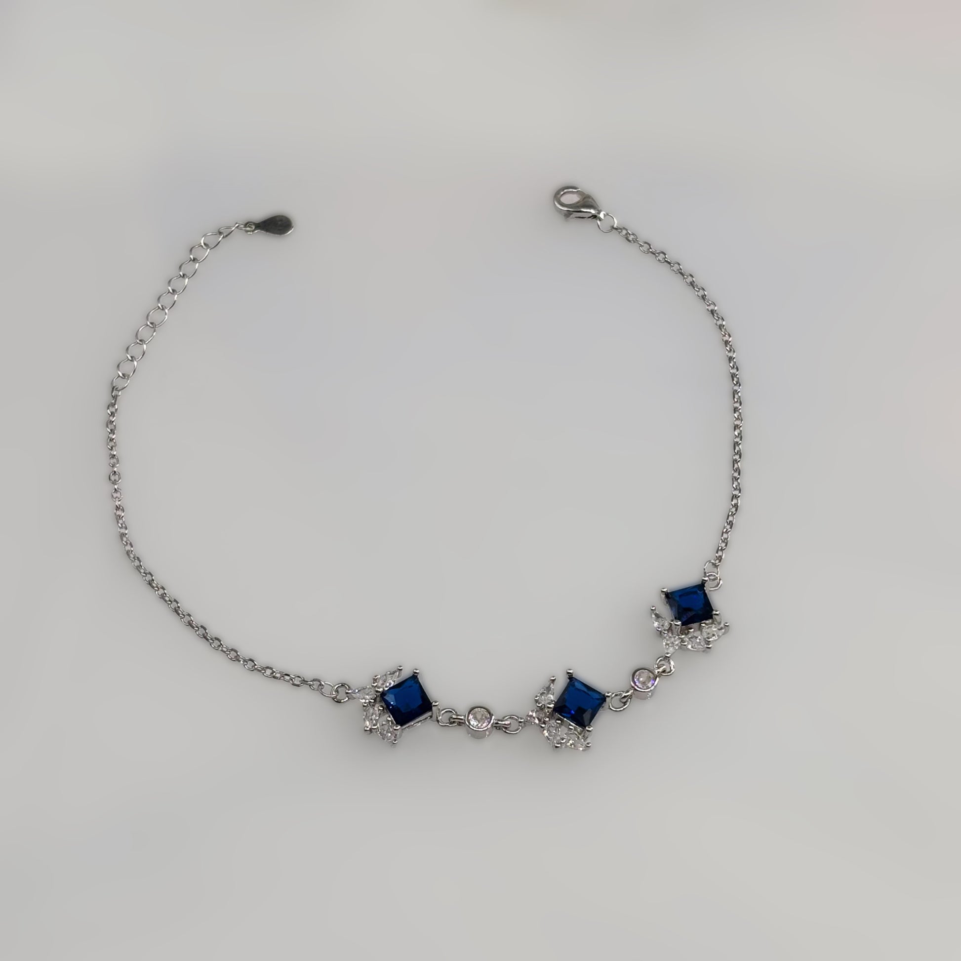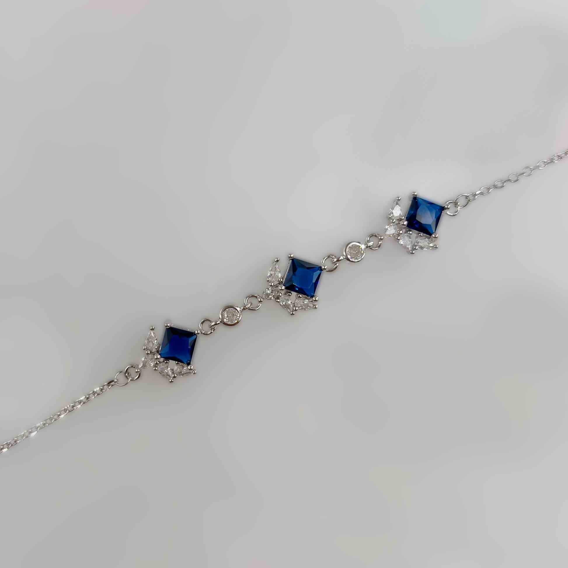 Indulge in timeless sophistication with the Royal Sapphire Square-Cut CZ Bracelet, crafted from authentic Italian 92.5 sterling silver. Featuring three deep sapphire-blue square–cut CZ stones, each adorned with a sparkling halo of micro CZ diamonds, this bracelet radiates classic luxury. The refined detailing and flawless craftsmanship make it a perfect accessory for evening wear, gifting, or any special occasion.