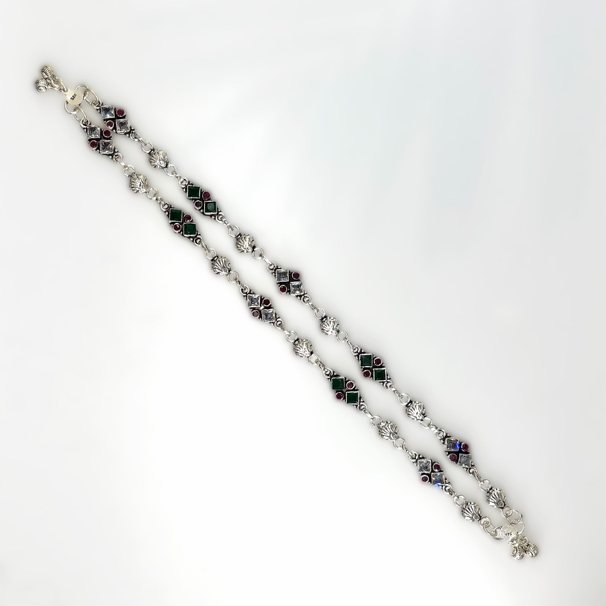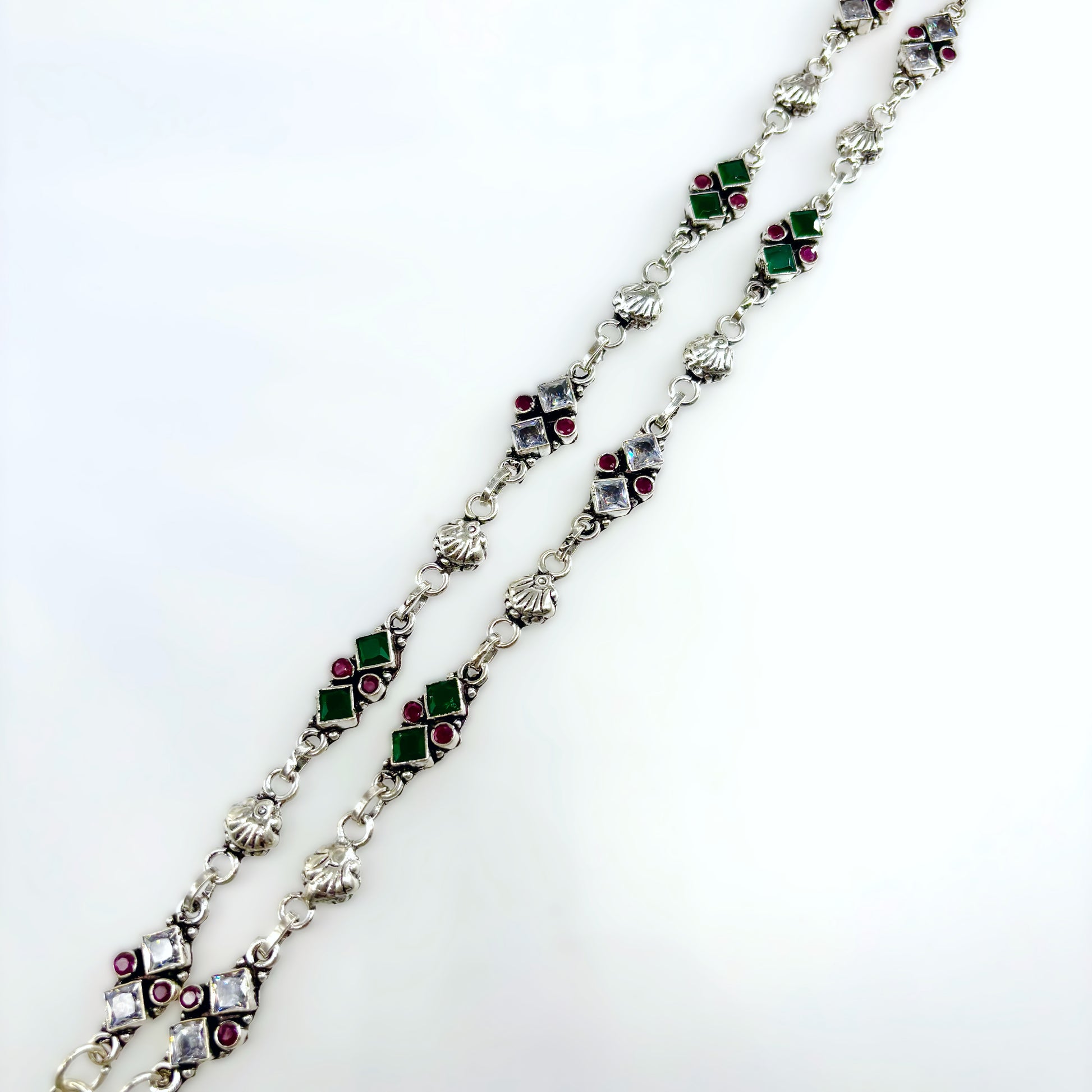 Embrace traditional elegance with this handmade oxidised silver anklet (payal), crafted from 92.5 sterling silver. Adorned with vibrant cut stones in  red, and white, this piece carries timeless artistry and intricate craftsmanship. The oxidised finish enhances its antique charm, making it a perfect blend of tradition and modern grace.