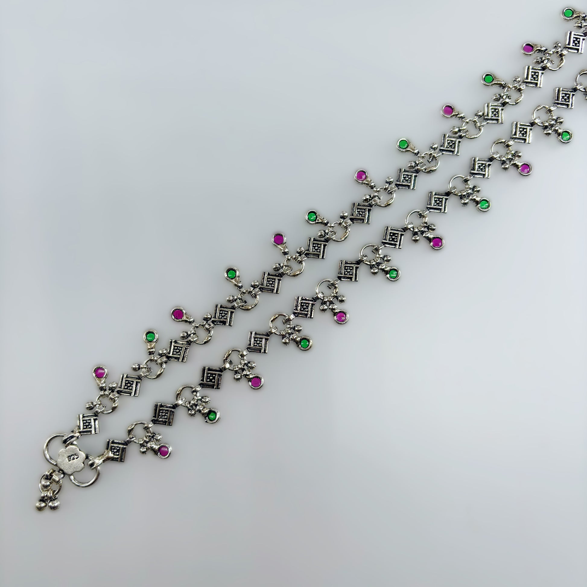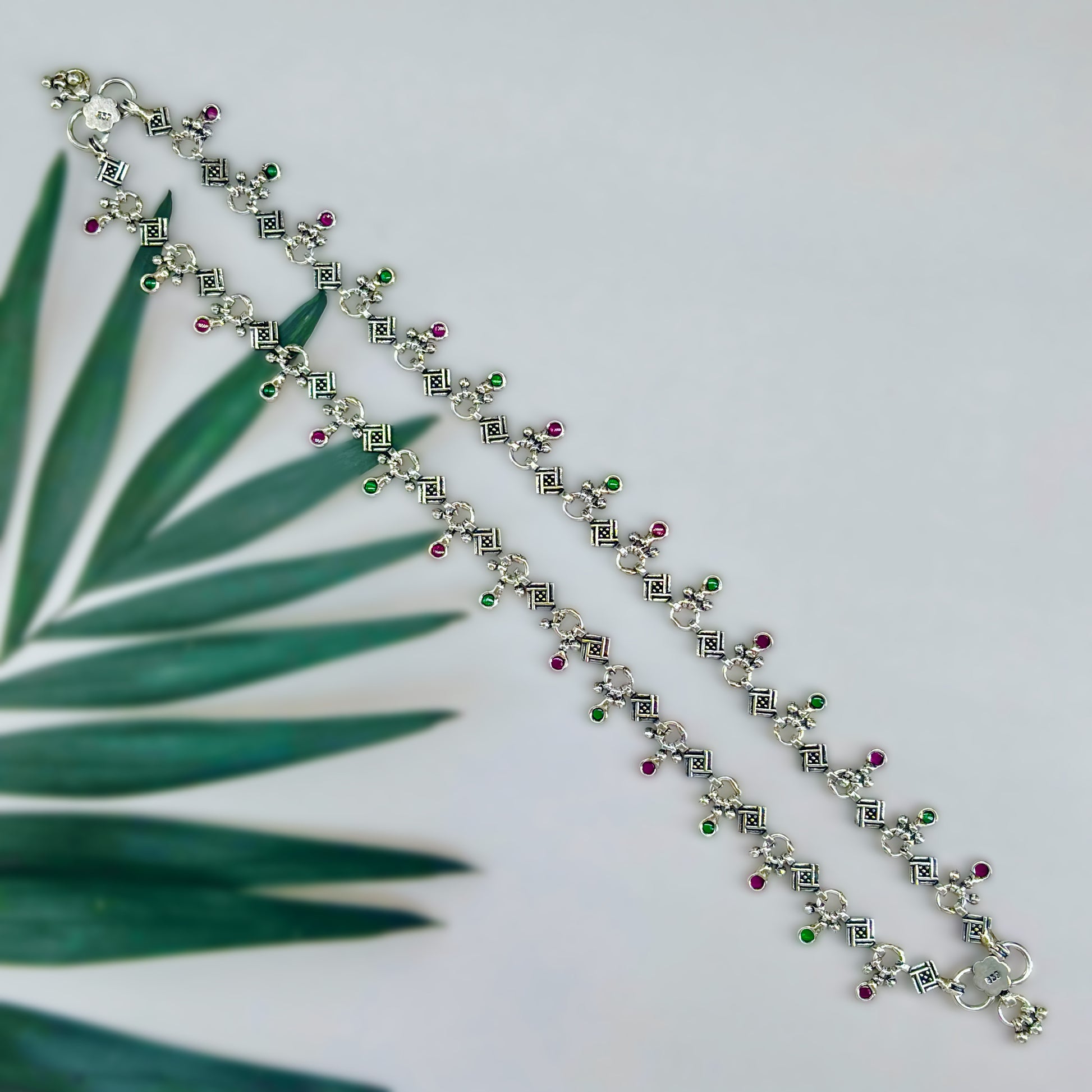 Celebrate tradition with a touch of elegance through this handmade oxidised silver payal (anklet), crafted from authentic 92.5 sterling silver. Featuring intricate design patterns highlighted with multi-colored cut stones, this payal reflects the beauty of artisanal craftsmanship. With a 10-inch length, it fits comfortably while making every step graceful and charming.